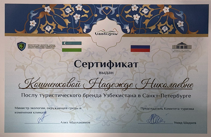 Генеральный директор «АэроТур» Надежда Кошненкова была удостоена почетного статуса Посла туристического бренда Узбекистана в Санкт-Петербурге.