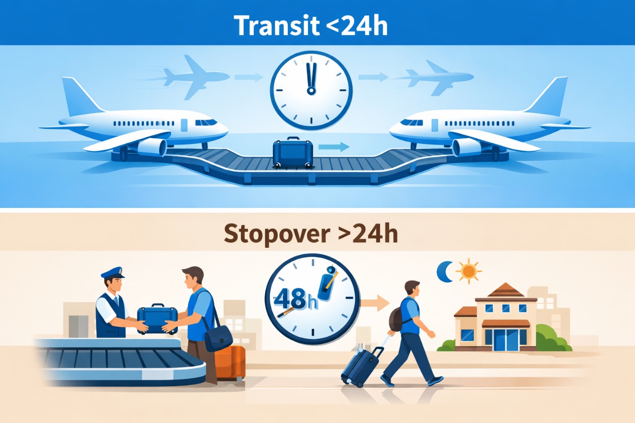 Если клиент остаётся в транзитном городе меньше суток, даже с выходом в город, технически это всё ещё считается длительной стыковкой, и правила оформления багажа будут другими.